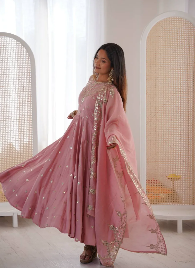 Product Highlights: The Baby Pink Roman Silk Anarkali stands out with embroidery sequence work, a length of 48–49 Inches, 3.75 Meter and ready-to-wear convenience for festive functions, family events, and celebratory outings.