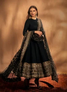 Perfect for festive gatherings, family functions, wedding events, and celebration wear, this Black Cotton Embroidered Anarkali Suit is designed to deliver standout style with versatile elegance.