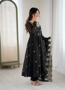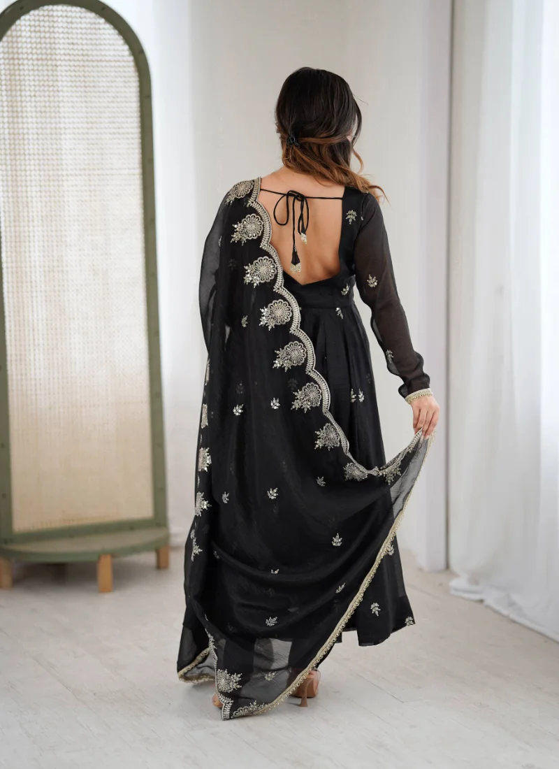 Product Highlights: From embroidery sequence work to its coordinated styling, the Black Crunchy Silk Gown Set delivers a length of 48–49 Inches, 4 Meter Flair and occasion-ready appeal in one set.