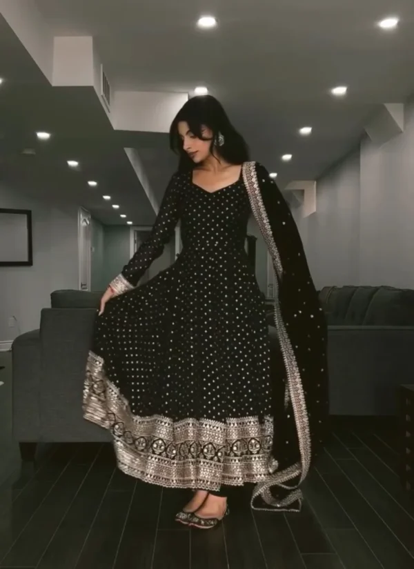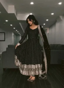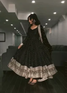 This Black Faux Blooming Embroidered Anarkali Suit is a flattering wardrobe essential that blends premium fabric, polished detailing, and easy wearability.