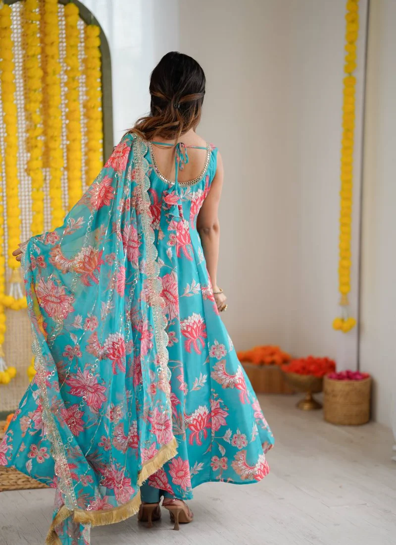 The Blue Muslin Print Gown Set is a versatile festive pick that pairs premium fabric with graceful movement and coordinated pieces.
