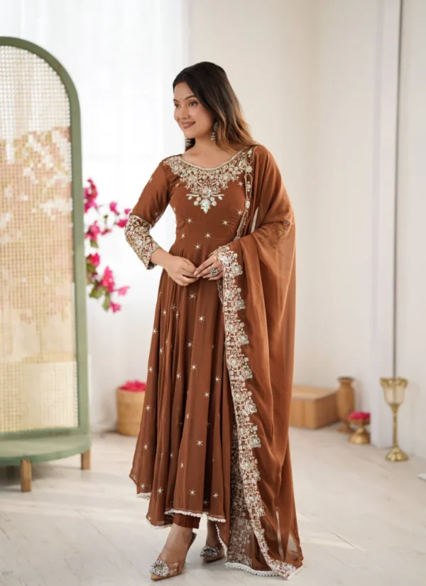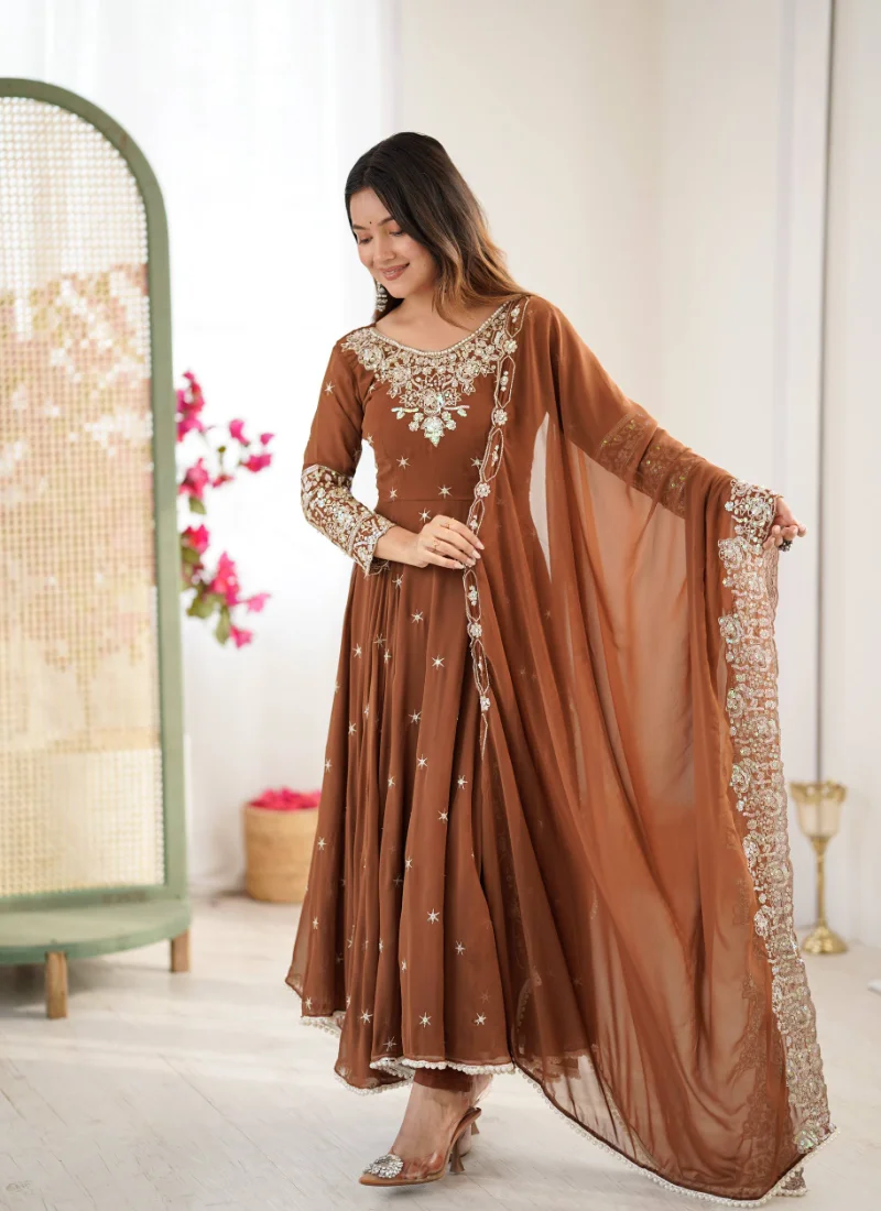 Product Highlights: Designed with heavy embroidery rainbow sequence with moti work, the Brown Blooming Faux Anarkali Set combines a length of 48–49 inches, 6 meters and practical ready-to-wear styling for standout dressing.