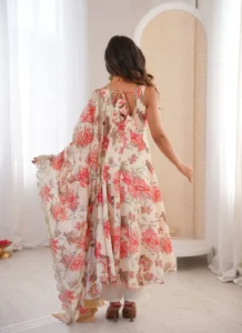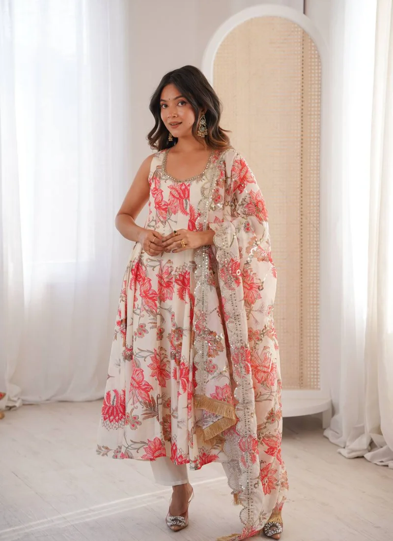 Product Highlights: The Cream Muslin Print Gown Set stands out with embroidery & sequence work with elegant border lace, a length of 48–49 Inches (Approx.), Approx. 4 Meters with Kali Cut and ready-to-wear convenience for festive functions, family events, and celebratory outings.