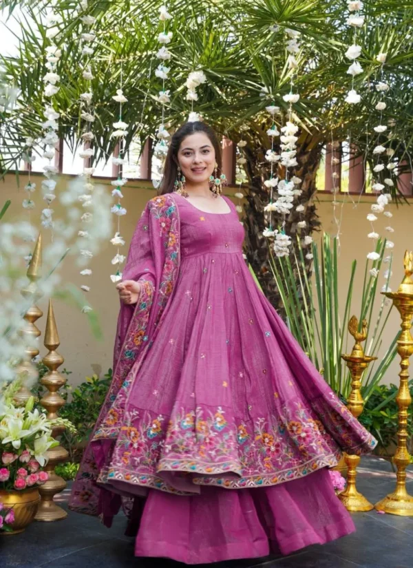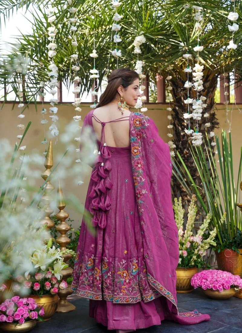 This Dusty Rose Silk Embroidered Salwar Suit is a flattering wardrobe essential that blends premium fabric, polished detailing, and easy wearability.