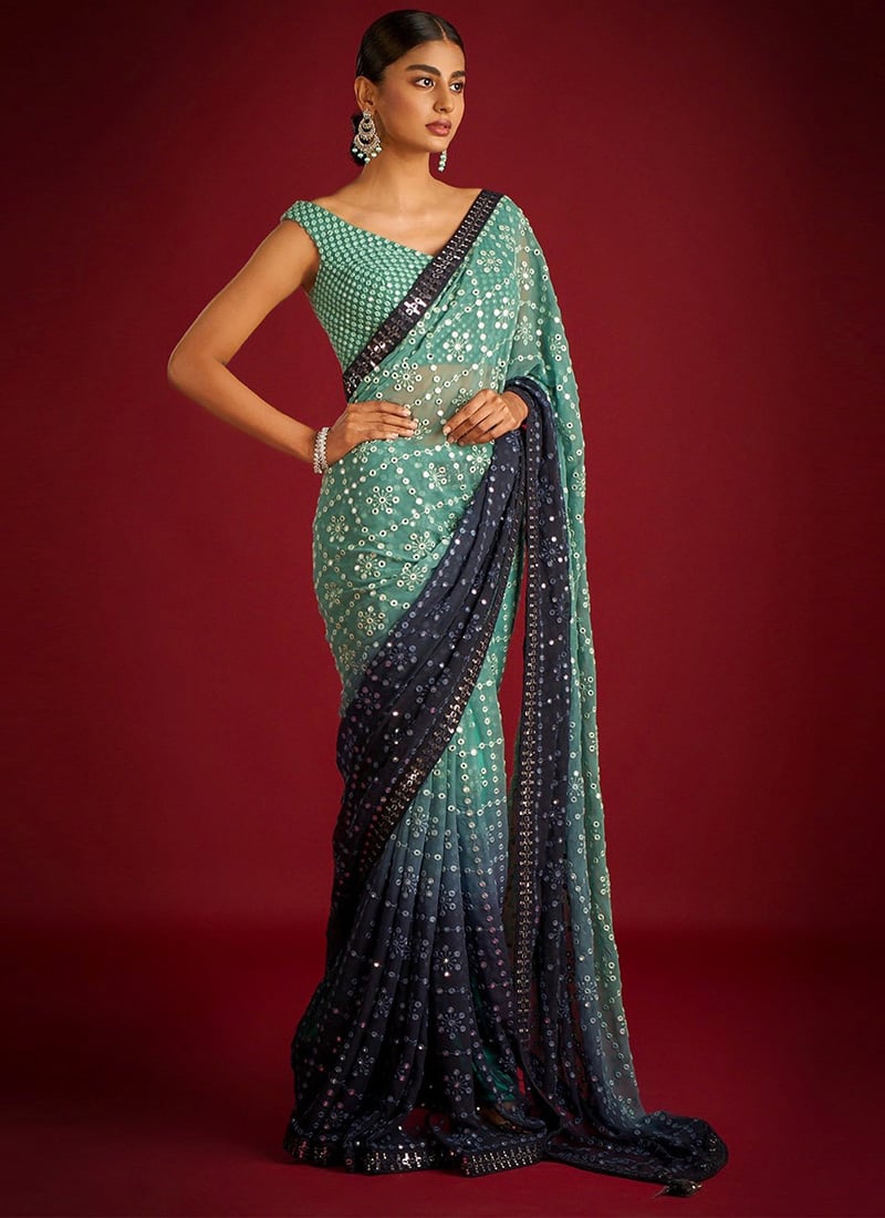 The Green Faux Georgette Saree with Sequins and Embroidery is an elegant ethnic drape designed to enhance your festive and party wear wardrobe. Crafted from premium faux georgette fabric, this saree offers a graceful fall with a soft sheen, making it ideal for celebrations, evening gatherings, and special occasions.