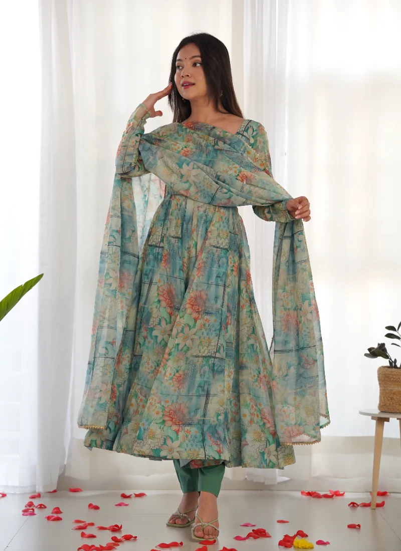 Product NameGreen Organza Silk Print Lace Work Anarkali Set