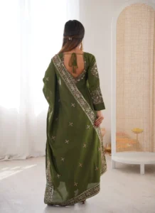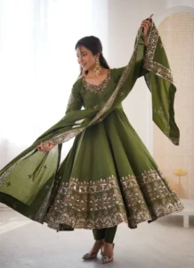 Created for celebrations and special gatherings, this Green Roman Silk Gown Set offers a balanced mix of comfort, flow, and detail.