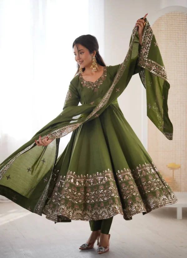 Product Highlights: Designed with embroidery sequence work, the Green Roman Silk Gown Set combines a length of 48–49 Inches, 3.75 Meter Flair and practical ready-to-wear styling for standout dressing.