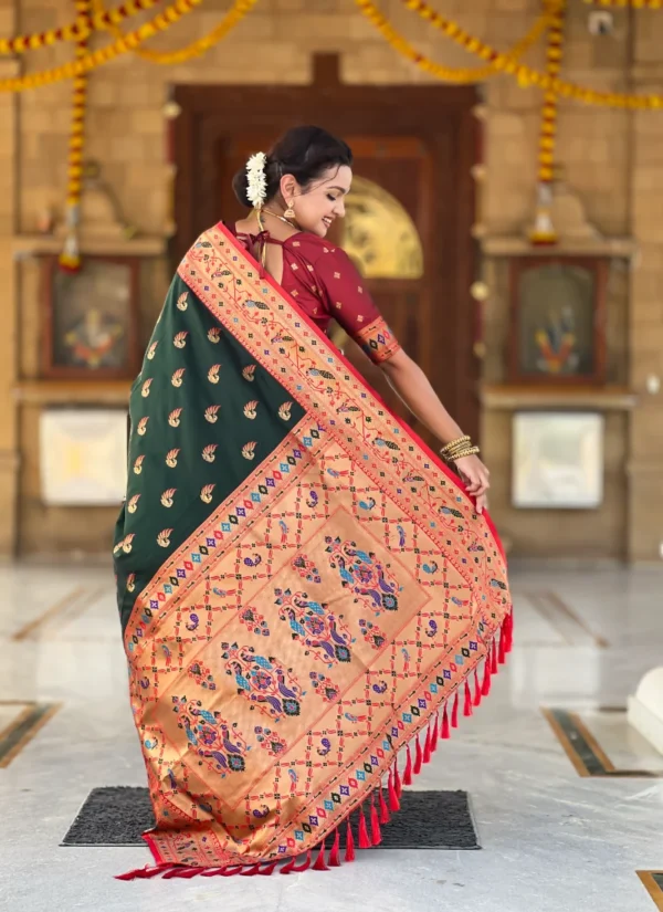 The saree features intricate woven motifs, a rich pallu, decorative border detailing, and tassels at the pallu end. Paired with a matching soft paithani silk saree with zari, this green paithani silk saree offers a coordinated and premium finish with a saree length of 5.5 Meter and blouse length of 0.8 Meter.