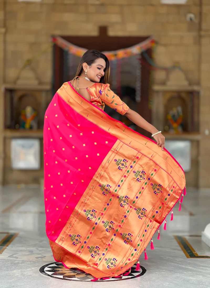 magenta soft Paithani saree is crafted in exact saree fabric name “Soft Paithani silk saree with zari” and offers a graceful traditional drape with woven zari appeal. The saree showcases Meenakari motifs, a rich pallu, weaving border detailing, and tassels at the pallu end for an elegant festive finish.