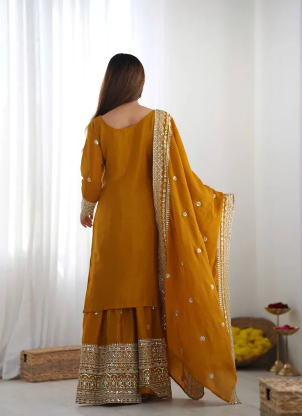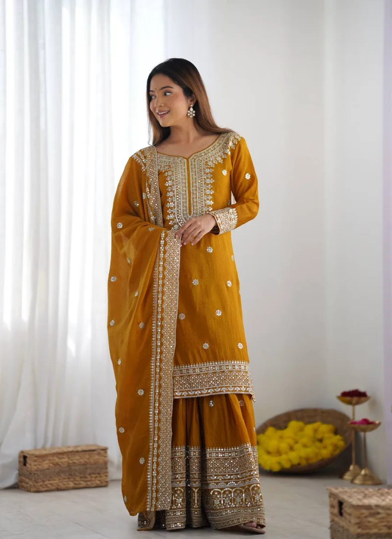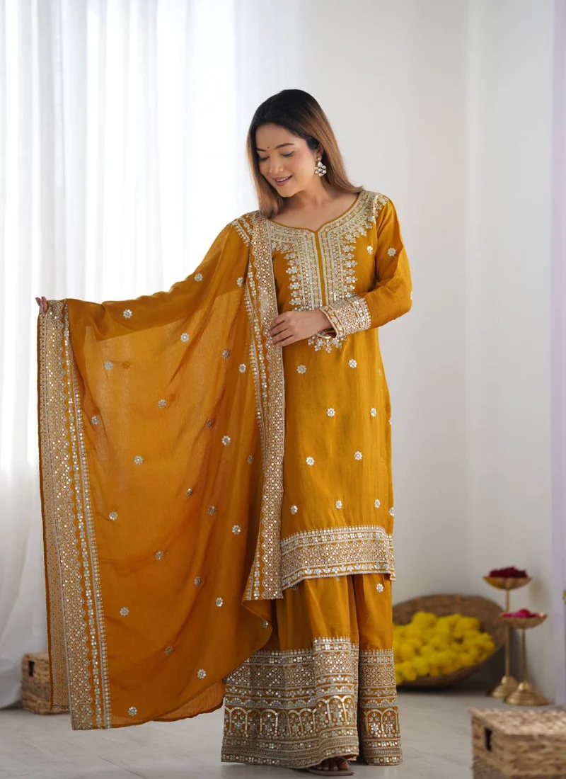 This chinnon silk sharara suit in Mustard is designed to bring a polished festive look with graceful movement and ready-to-wear comfort. Crafted with Pure Heavy Chinnon Silk with Embroidery and 5mm Sequence Work, the coordinated set delivers a refined ethnic silhouette that works beautifully for celebrations, festive gatherings, family functions, and statement occasion dressing.