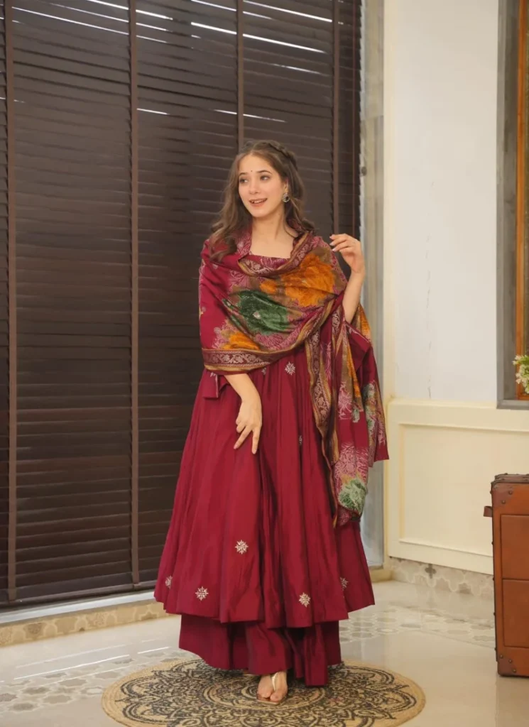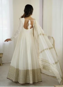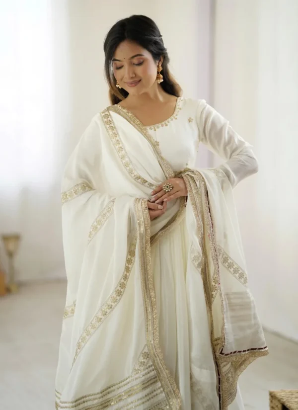 This Off White Chinon Embroidered Anarkali Suit is a flattering wardrobe essential that blends premium fabric, polished detailing, and easy wearability.