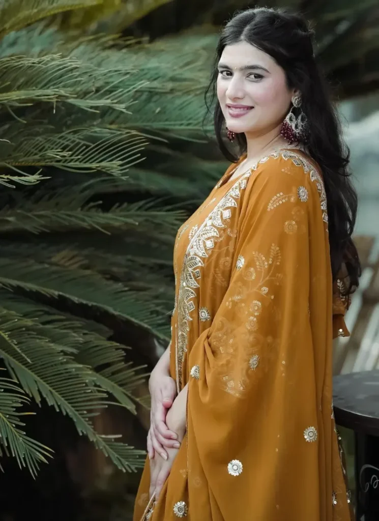 With its flattering drape and refined finish, the kurta highlights embroidery work and a graceful neckline. The stitched bottom and matching dupatta make this set ideal for effortless dressing across festive and semi-formal moments.