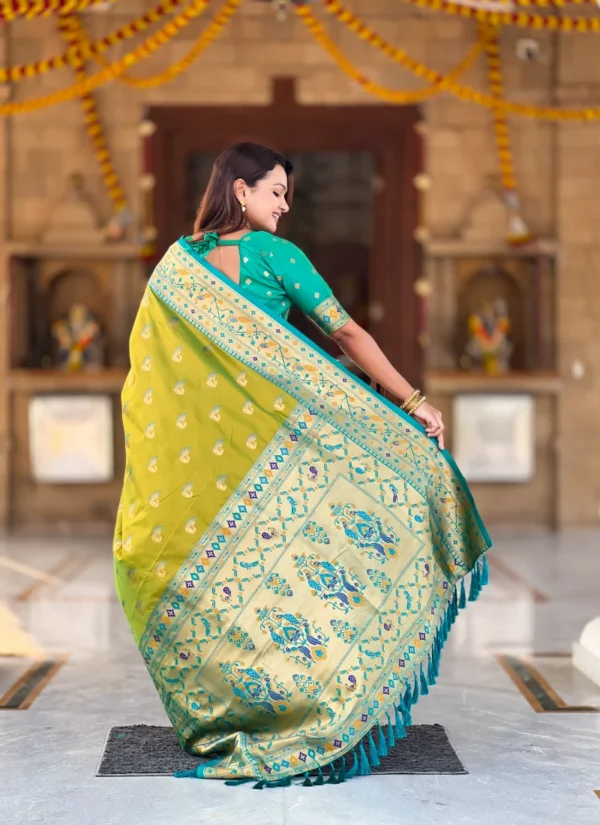 The saree features intricate woven motifs, a rich pallu, decorative border detailing, and tassels at the pallu end. Paired with a matching soft paithani silk saree with zari, this pastel green paithani silk saree offers a coordinated and premium finish with a saree length of 5.5 Meter and blouse length of 0.8 Meter.
