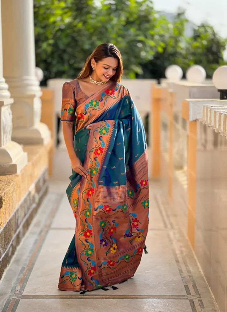 Style this pastel green paithani silk saree with statement jewellery and heels for an elegant traditional ensemble. Its woven artistry and classic drape make it a beautiful choice for gifting and occasion wear.