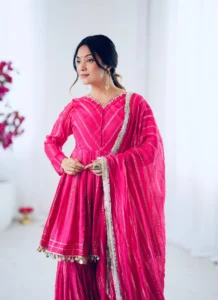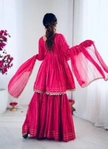 Style this mal chanderi sharara suit with traditional earrings, heels, or embellished flats for a complete ethnic look. Whether you are shopping for festive wear, party wear, or gifting, this color-rich outfit offers premium presentation, comfort, and timeless wardrobe value.
