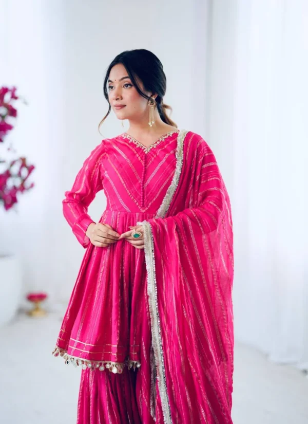This mal chanderi sharara suit in Pink is designed to bring a polished festive look with graceful movement and ready-to-wear comfort. Crafted with Mal Chanderi, the coordinated set delivers a refined ethnic silhouette that works beautifully for celebrations, festive gatherings, family functions, and statement occasion dressing.
