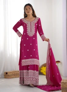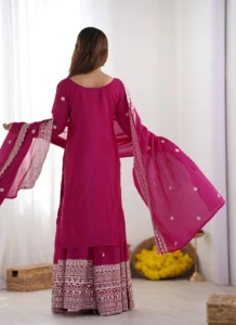 Style this chinnon silk sharara suit with traditional earrings, heels, or embellished flats for a complete ethnic look. Whether you are shopping for festive wear, party wear, or gifting, this color-rich outfit offers premium presentation, comfort, and timeless wardrobe value.