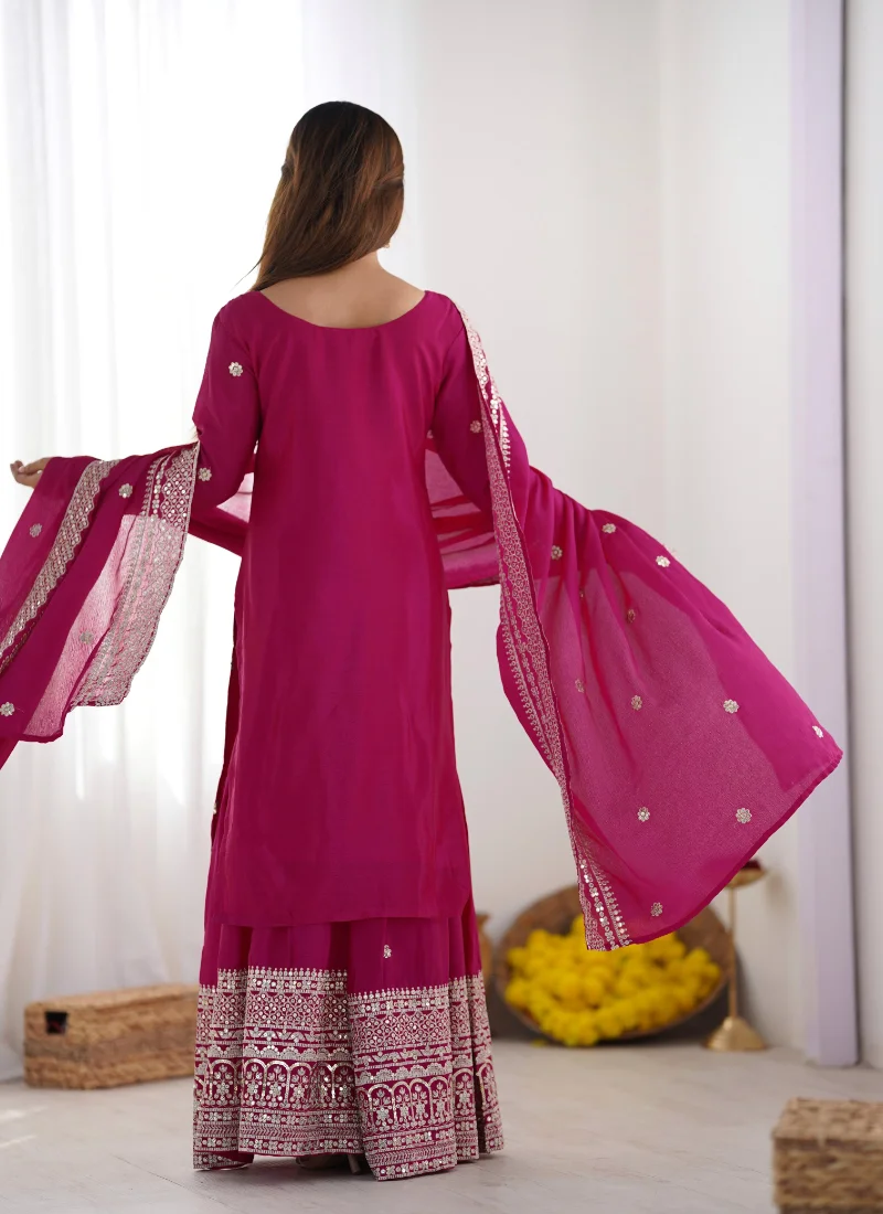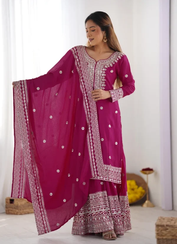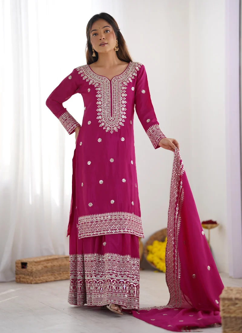 This chinnon silk sharara suit in Pink is designed to bring a polished festive look with graceful movement and ready-to-wear comfort. Crafted with Pure Heavy Chinnon Silk with Embroidery and 5mm Sequence Work, the coordinated set delivers a refined ethnic silhouette that works beautifully for celebrations, festive gatherings, family functions, and statement occasion dressing.