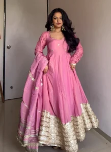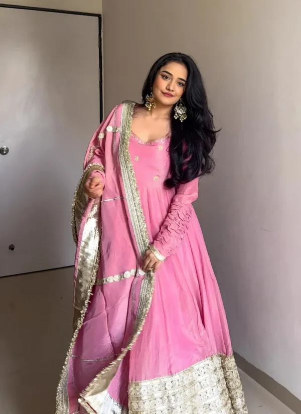 This Pink Silk Embroidered Anarkali Suit is a flattering wardrobe essential that blends premium fabric, polished detailing, and easy wearability.