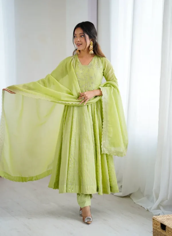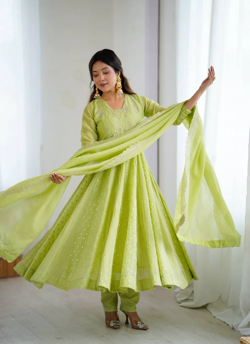 Product Highlights: The Pista Green Anarkali Gown Anarkali stands out with embroidery sequence work, lace border, a length of 47–48 inches, coordinated styling and ready-to-wear convenience for festive functions, family events, and celebratory outings.