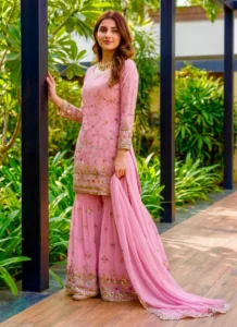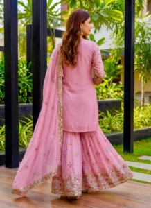 This faux georgette sharara suit in Pink is designed to bring a polished festive look with graceful movement and ready-to-wear comfort. Crafted with Faux Georgette, the coordinated set delivers a refined ethnic silhouette that works beautifully for celebrations, festive gatherings, family functions, and statement occasion dressing.