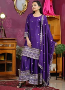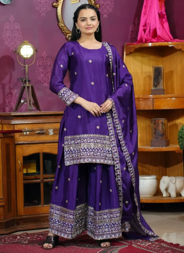 Perfect for festive gatherings, family functions, wedding events, and celebration wear, this Purple Chinon Embroidered Salwar Suit is designed to deliver standout style with versatile elegance.