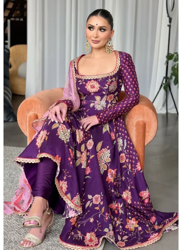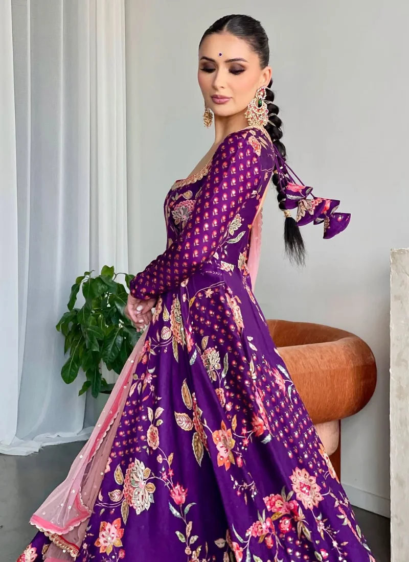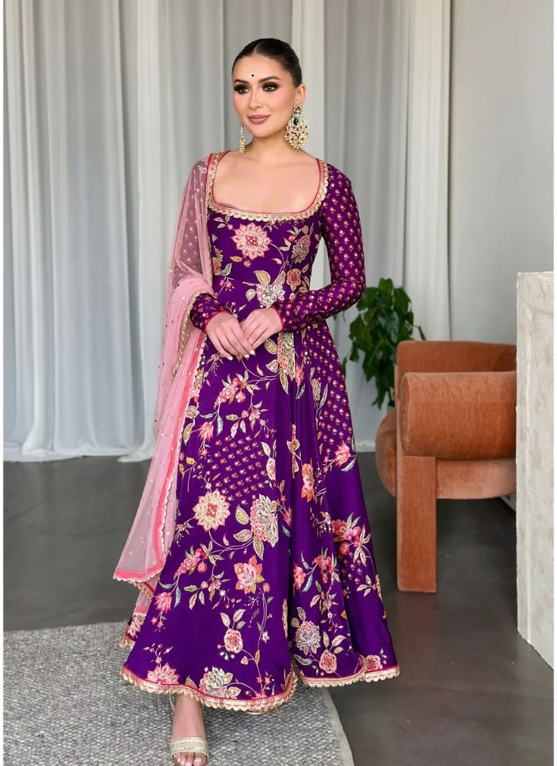 Product Highlights: The Purple Faux Georgette, Palazzo Set offers heavy embroidery sequence work with diamond hand work, giving the top a, embroidery sequence work with lace border, creating a beautifully detailed, a length of 51-52 inches, offering a flattering, full-length fit., coordinated styling and a polished ethnic look that transitions easily across festive occasions.
