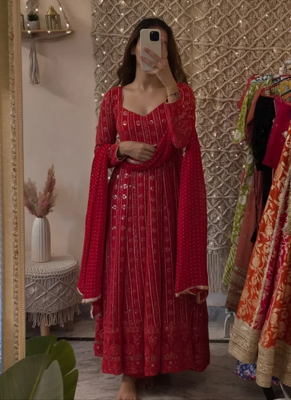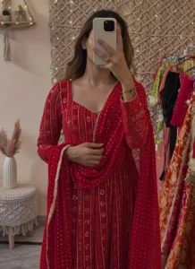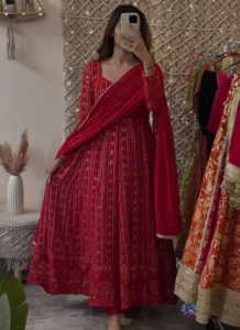 Whether styled for festive outings, party wear, or traditional celebrations, this Red Faux Blooming Embroidered Salwar Suit offers a premium ethnic look that feels timeless and easy to accessorize.