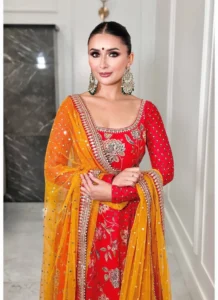 Created for celebrations and special gatherings, this Red Faux Georgette, Palazzo Set offers a balanced mix of comfort, flow, and detail.