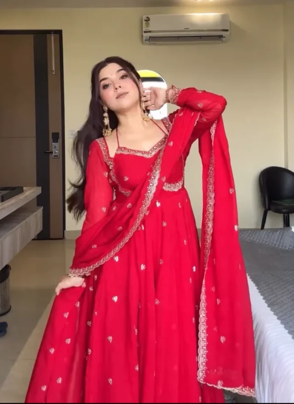 Whether styled for festive outings, party wear, or traditional celebrations, this Red Georgette Embroidered Anarkali Suit offers a premium ethnic look that feels timeless and easy to accessorize.