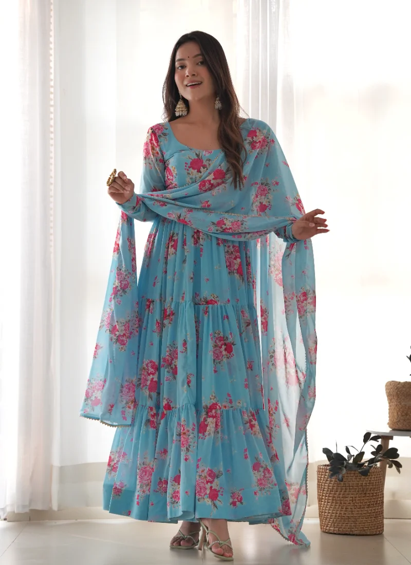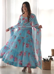 This Sky Blue Fox Georgette Anarkali brings together refined fabric, thoughtful finishing, and an easy ready-to-wear silhouette.