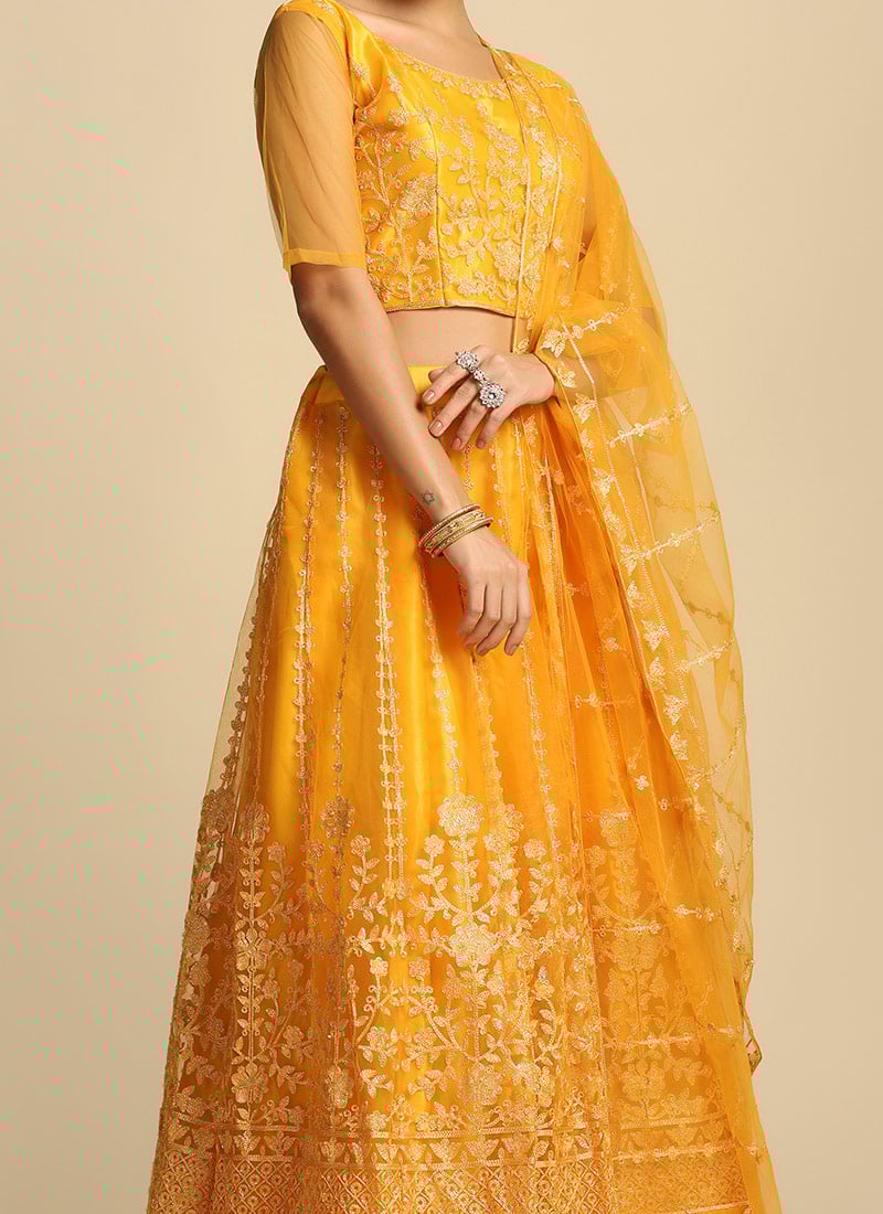 Fabric: Net Work: Embroidery Style: A-Line Lehenga with Matching Choli Occasion: Haldi, Wedding, Festive, Party Wear Care Instructions: Dry Clean Recommended