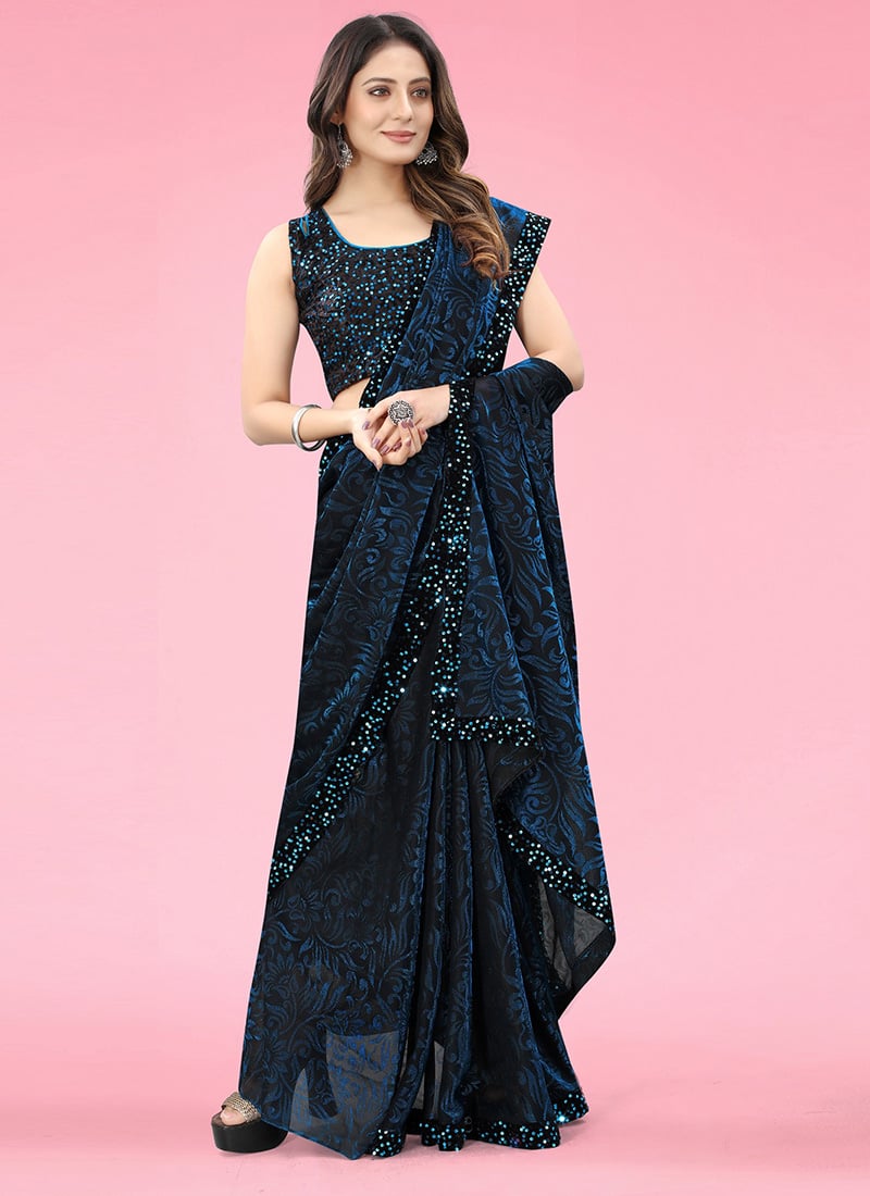 The Teal Lycra Saree with Brasso Sequins Border is a contemporary ethnic drape designed for glamorous party wear and stylish festive occasions. Crafted from stretchable lycra fabric, this saree offers a sleek, body-hugging silhouette with effortless comfort, making it ideal for modern celebrations.