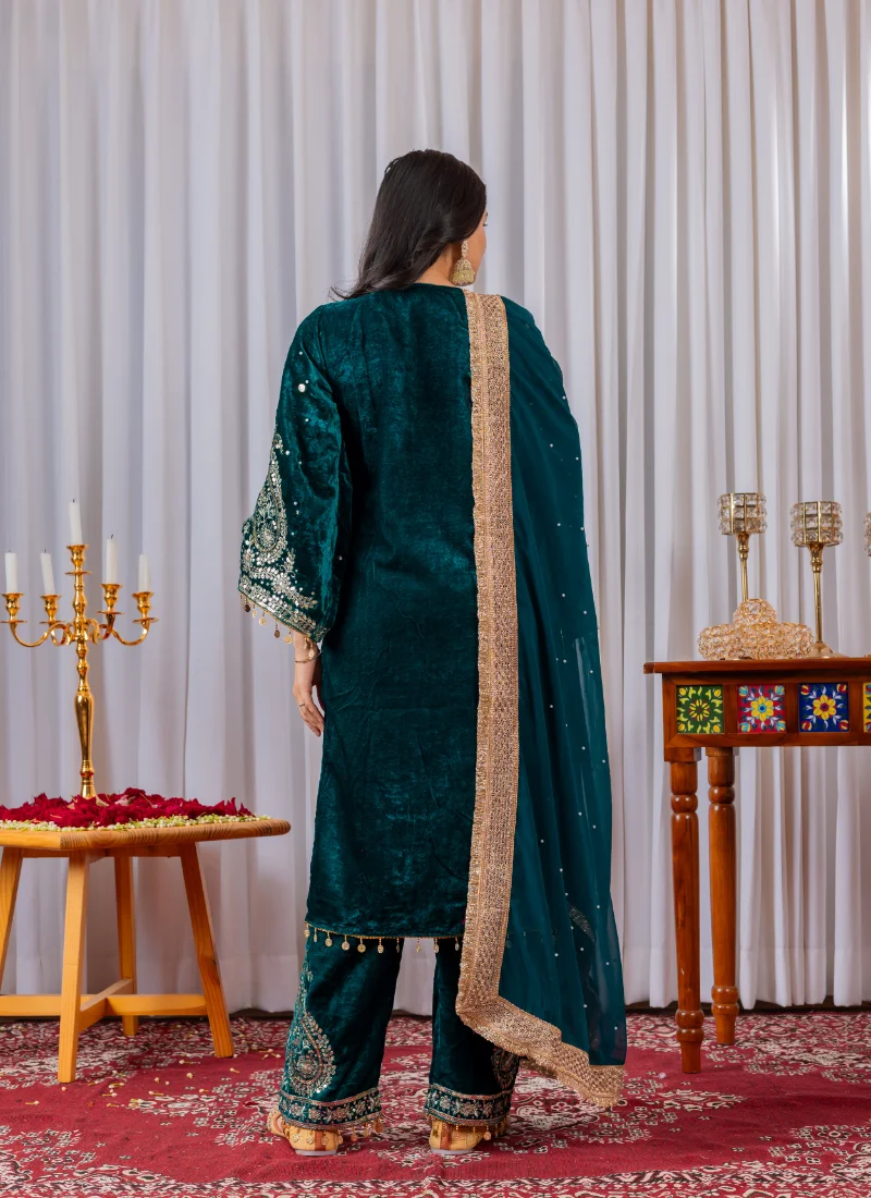 This Teal Viscose Velvet Suit Set brings together refined fabric, thoughtful finishing, and an easy ready-to-wear silhouette.