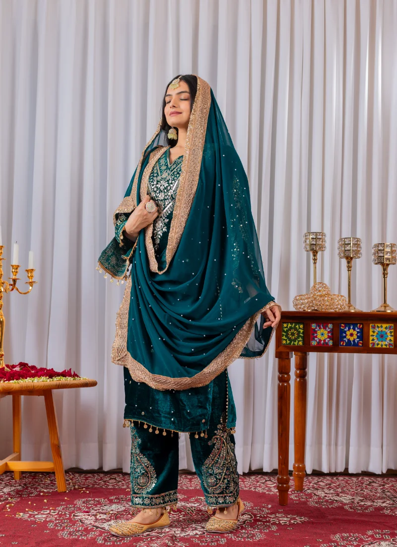 Product Highlights: From thread & sequence work with fancy lace, thread with sequence work to its coordinated styling, the Teal Viscose Velvet Suit Set delivers a length of 43–44 Inches, coordinated styling and occasion-ready appeal in one set.