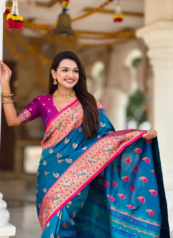 turquoise paithani silk saree is crafted in Soft Paithani Silk Saree with Zari and styled with elegant Meenakari weaving details for a rich festive look. This graceful saree is designed to bring timeless ethnic charm to weddings, festive celebrations, and traditional occasions.