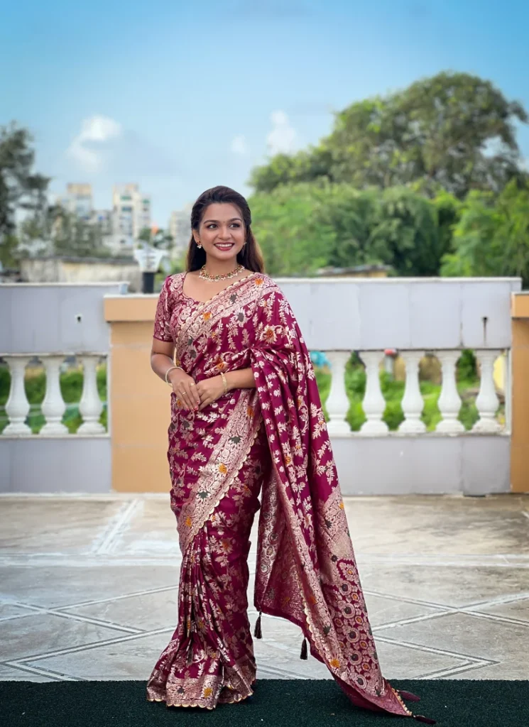 WorkSoft Paithani silk saree with zari weaving Meenakari motifs design and Meenakari weaving Rich pallu with Meenakari weaving border & Tassels attached at Pallu end. Blouse :- Enrich silk weaving contrast blouse piece with sleeve border