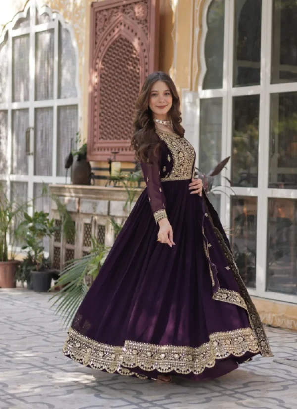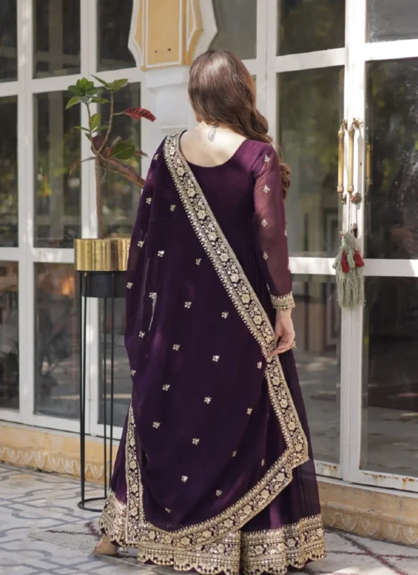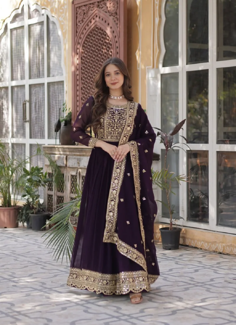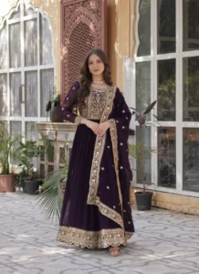 Perfect for festive gatherings, family functions, wedding events, and celebration wear, this Wine Georgette Embroidered Anarkali Suit is designed to deliver standout style with versatile elegance.