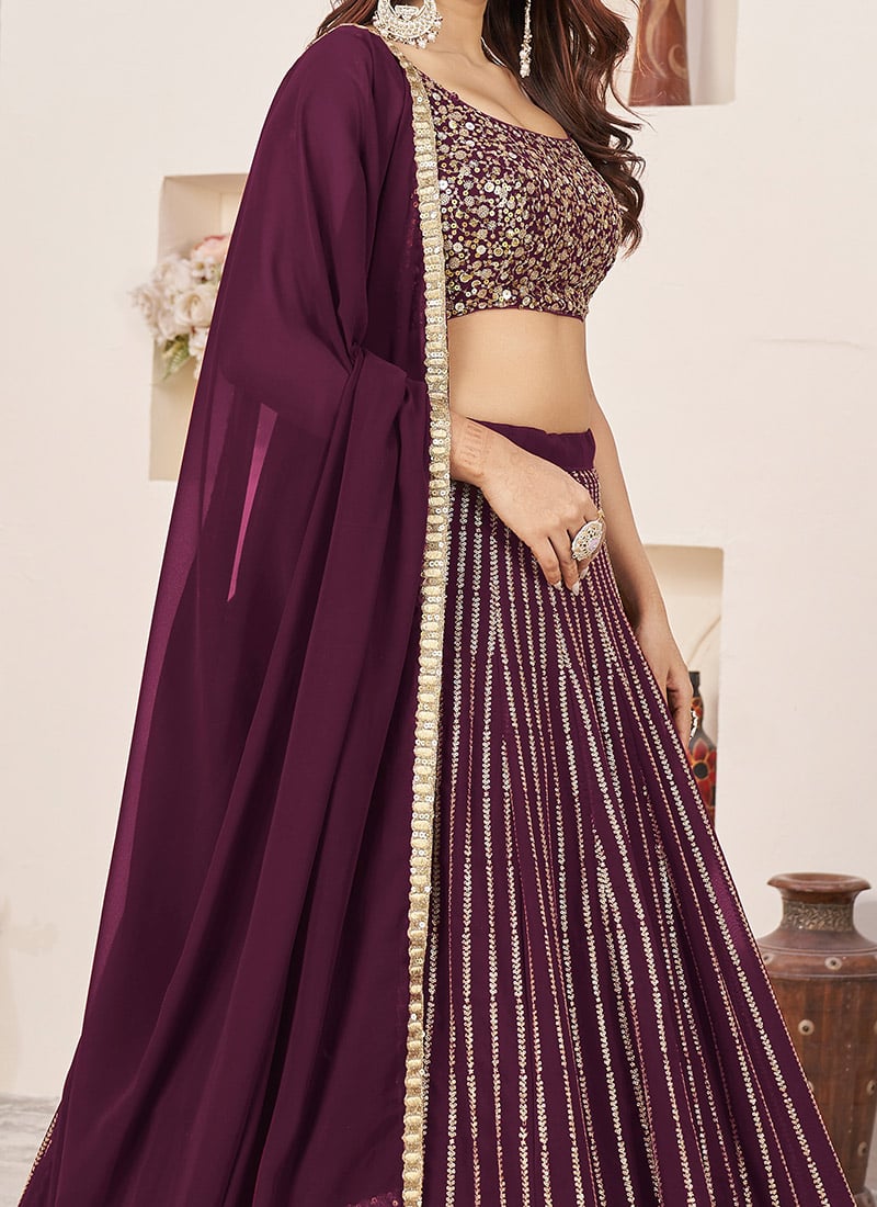 Perfect for weddings, receptions, festive gatherings, and evening parties, this Wine Georgette Lehenga Choli with Zari & Sequins Embroidery for Weddings can be styled with statement jewelry and heels for a timeless and sophisticated ethnic appearance.