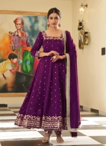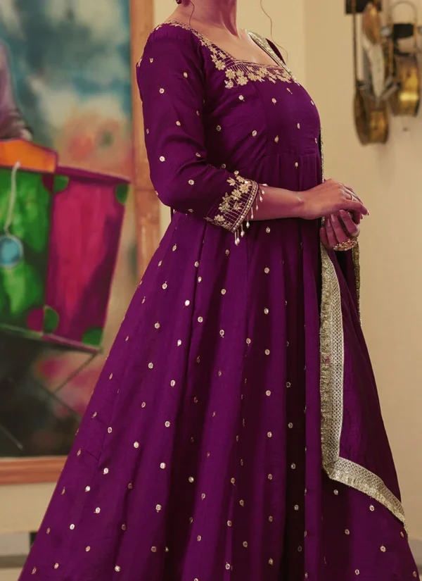 Crafted in Vichitra Silk, the set combines a flowy anarkali kurta with matching palazzo styling and dupatta coordination for a complete outfit. The embroidered finish and rich wine tone make it a strong choice for festive functions, family celebrations, and party wear.