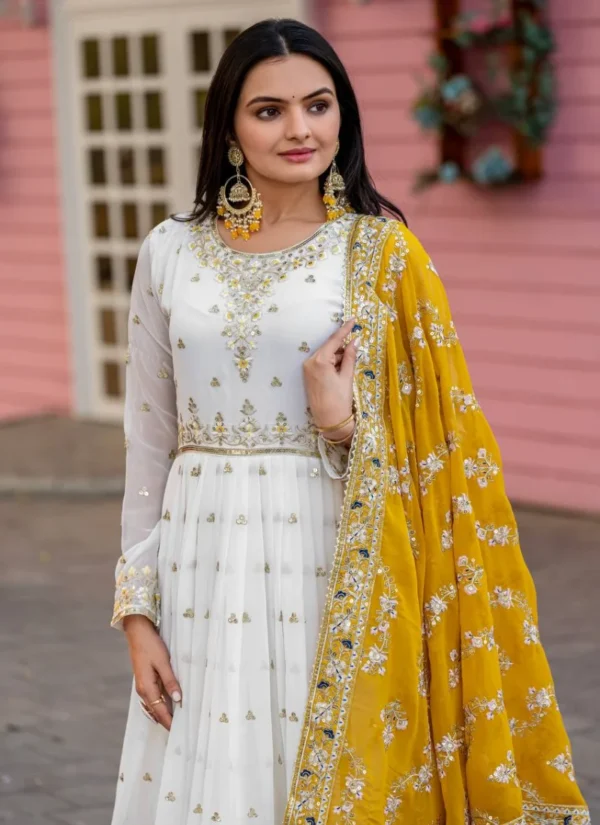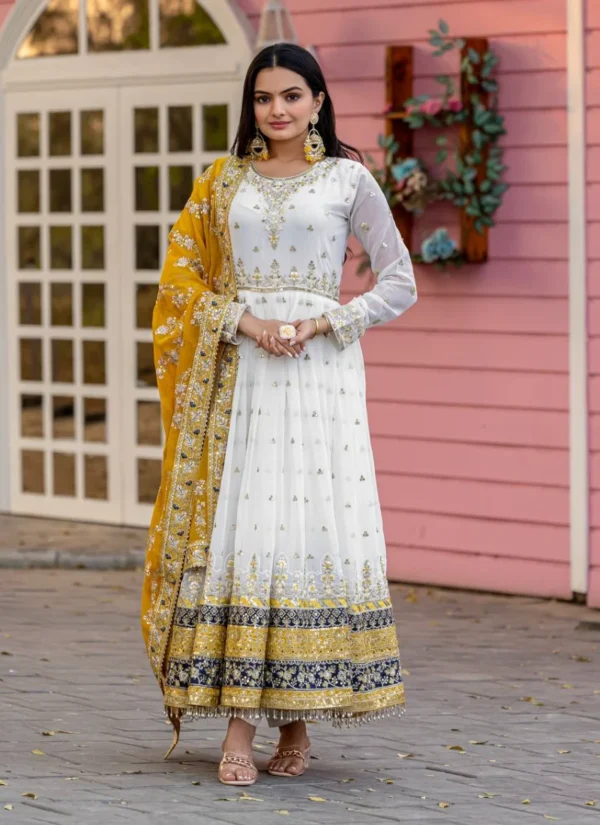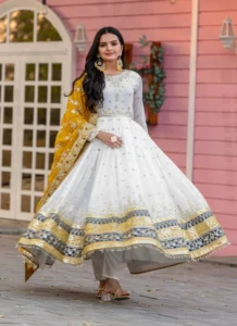 The faux georgette base gives the outfit a fluid drape, while the embroidered finish enhances its festive appeal. Designed in a flattering anarkali silhouette, this set offers a polished ethnic look that works beautifully for parties, celebrations, and wedding functions.
