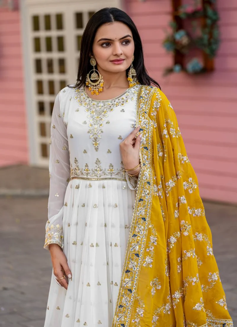 Make a refined festive statement with this Yellow Faux Georgette Embroidered Anarkali Gown Set, tailored to deliver graceful movement, rich detailing, and occasion-ready elegance.
