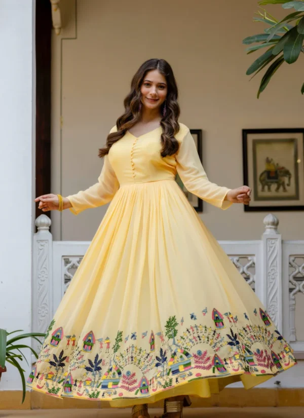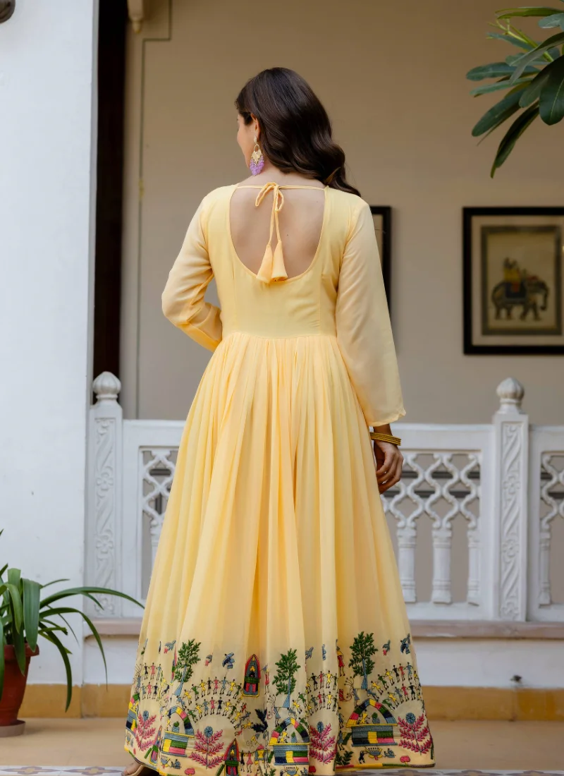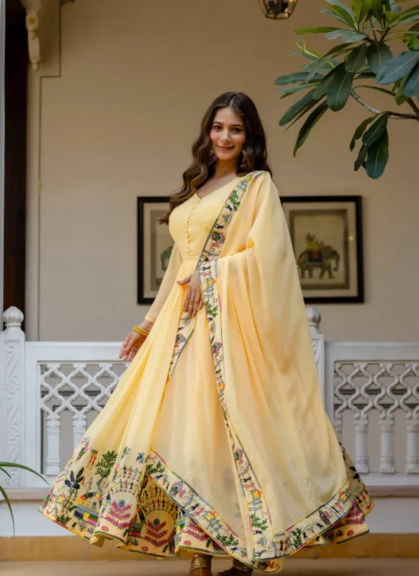 From intimate functions to larger festive gatherings, this Yellow Faux Georgette Embroidered Gown with Dupatta is made to deliver comfort, polish, and timeless ethnic appeal.