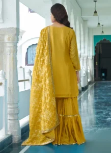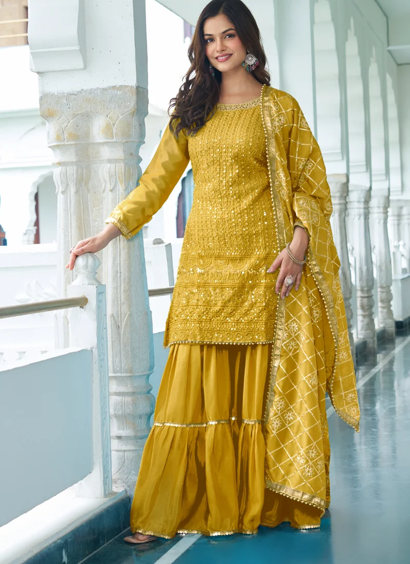 This chinnon silk sharara suit in Yellow is designed to bring a polished festive look with graceful movement and ready-to-wear comfort. Crafted with Heavy Chinnon Silk with heavy embroidery and 5mm & 3mm sequence work (less on sleeves), the coordinated set delivers a refined ethnic silhouette that works beautifully for celebrations, festive gatherings, family functions, and statement occasion dressing.